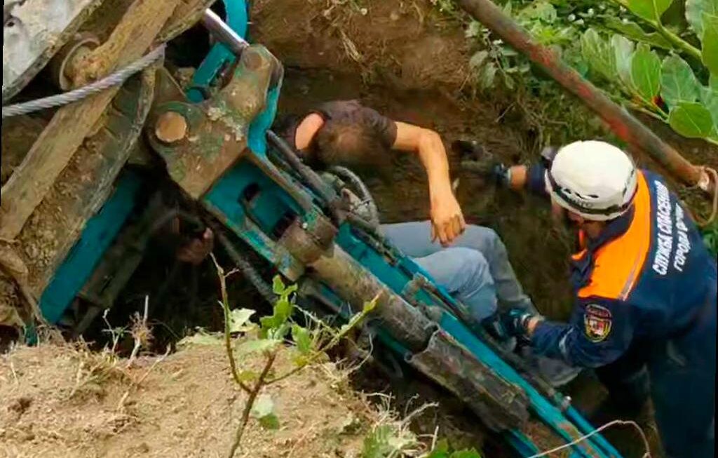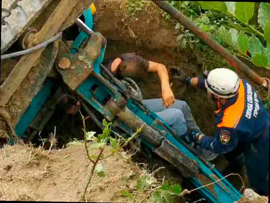 В Хостинском районе Сочи произошел неприятный инцидент. Во время строительных работ экскаватор упал в канаву, блокируя водителя — 40-летнего местного жителя.