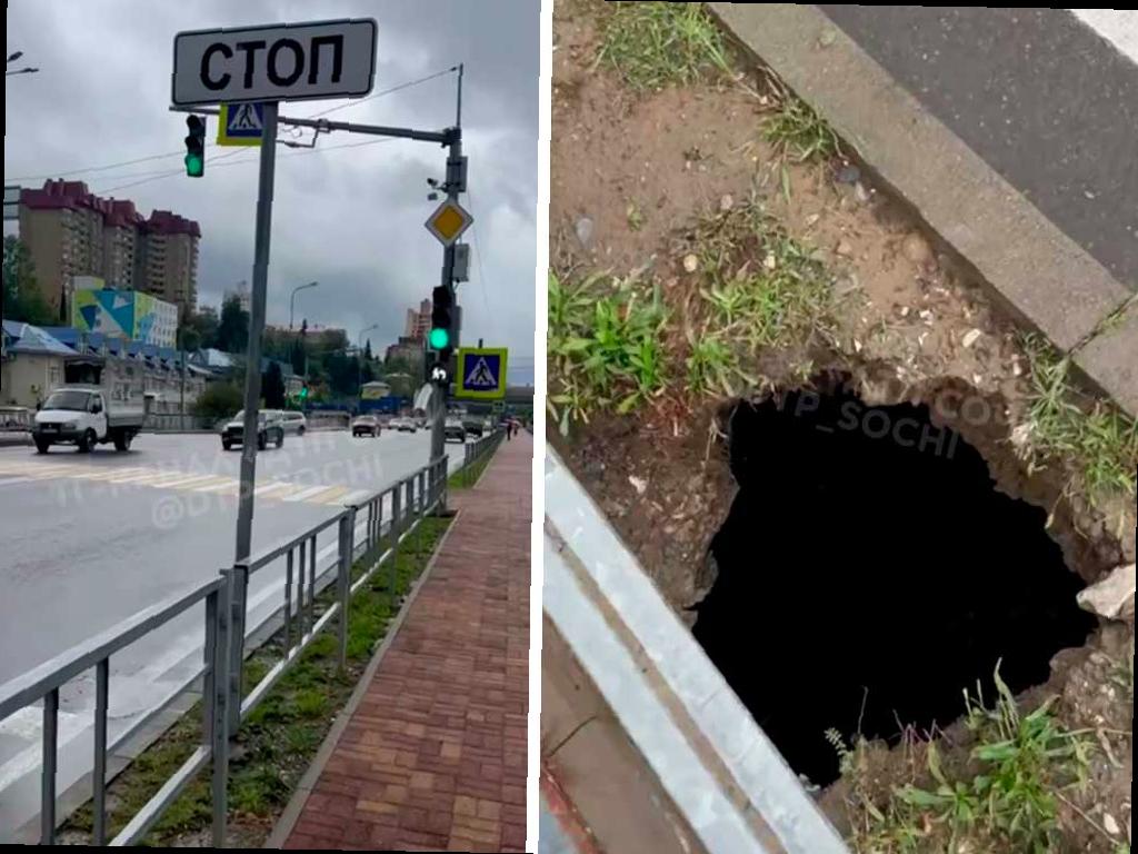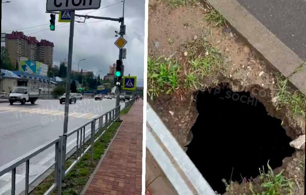 В Центральном районе Сочи, на улице Пластунской возле СГУ, был замечен провал грунта. Об этом сообщил телеграм-канал «ДТП Сочи», опубликовав видеозапись с места события.