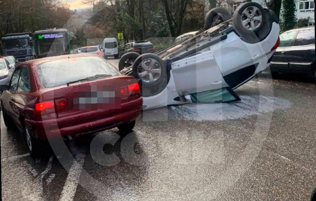 По улице Макаренко в Центральном районе Сочи произошел необычный инцидент — легковой автомобиль оказался перевернутым на крыше. Фото с места происшествия опубликовал телеграм-канал «ЧП Сочи».